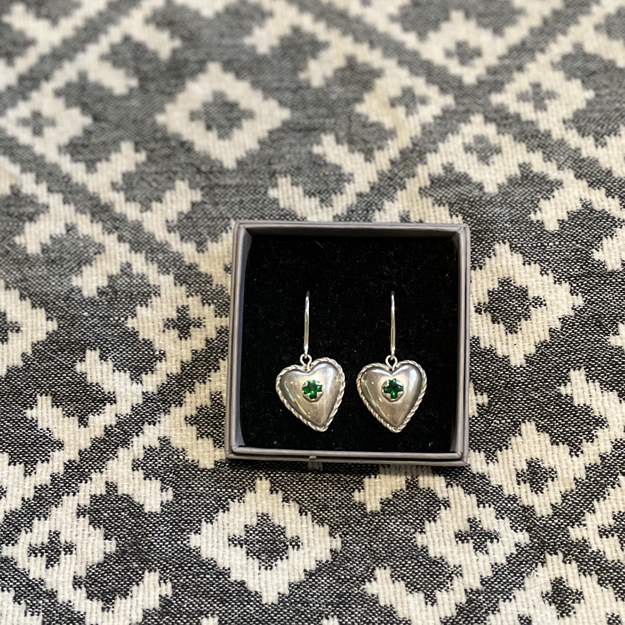 Kullassepatööna valminud südamed, mõõtudega 19×19 mm, peal 5 mm klaaskivi.
