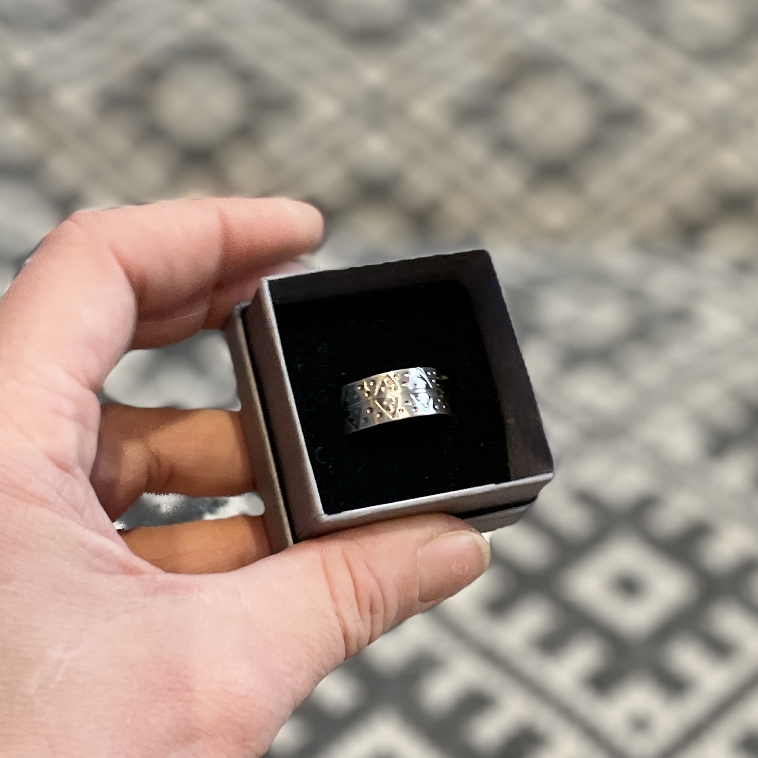 Esileht / METALLEHISTÖÖ / Sõrmus HUNDIHAMBAD Sõrmus HUNDIHAMBAD75.00€ sis. KM 1 laos Sõrmus HUNDIHAMBAD kogus Lisa korvi Kategooria: METALLEHISTÖÖ Kirjeldus Kirjeldus Sõrmus punseldatud mustritega. sõrmuse mõõdud : laius 9,54 mm Sõrmuse suurus 20,5 kaal: 4,8 gr Kullassepatööna valminud. Seotud tooted Süda rohelise kiviga 75.00€ sis. KM Lisa korvi Sõrmus Südamed 60.00€ sis. KM Lisa korvi Kee Mustikad 120.00€ sis. KM Lisa korvi Kee Südamega 165.00€ sis. KM Lisa korvi